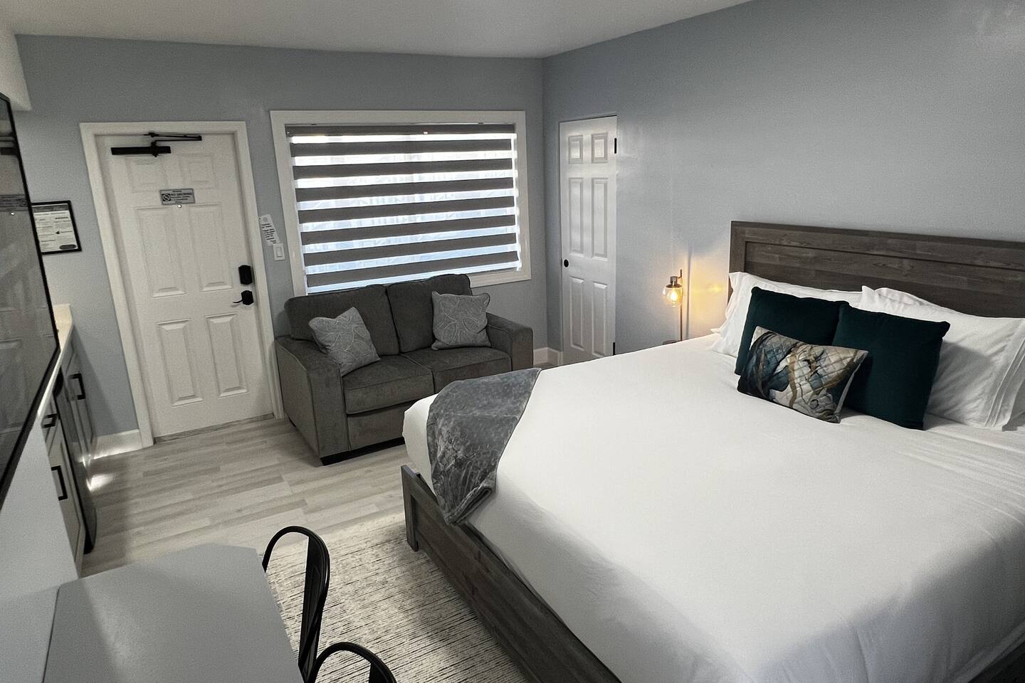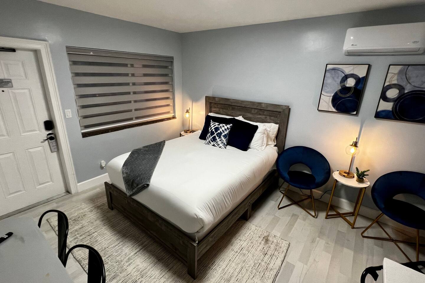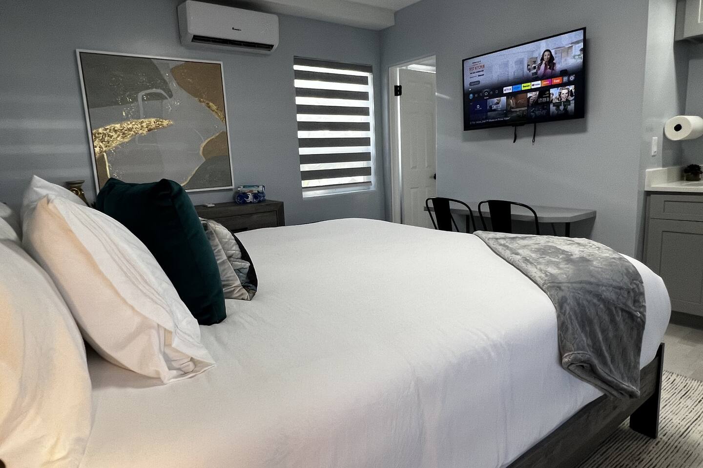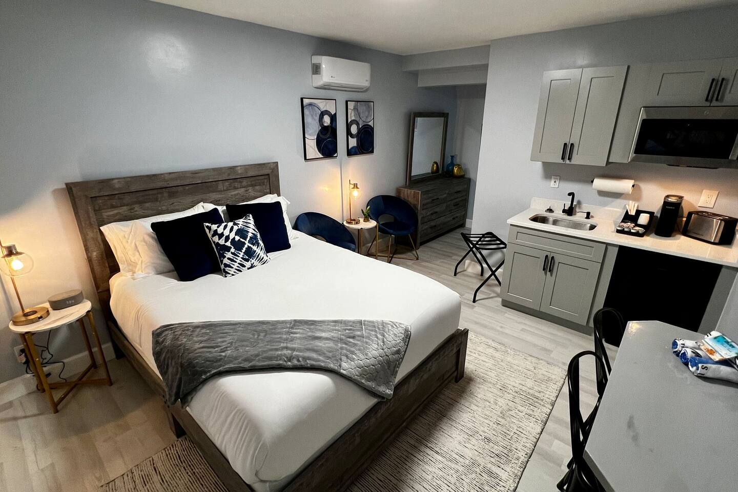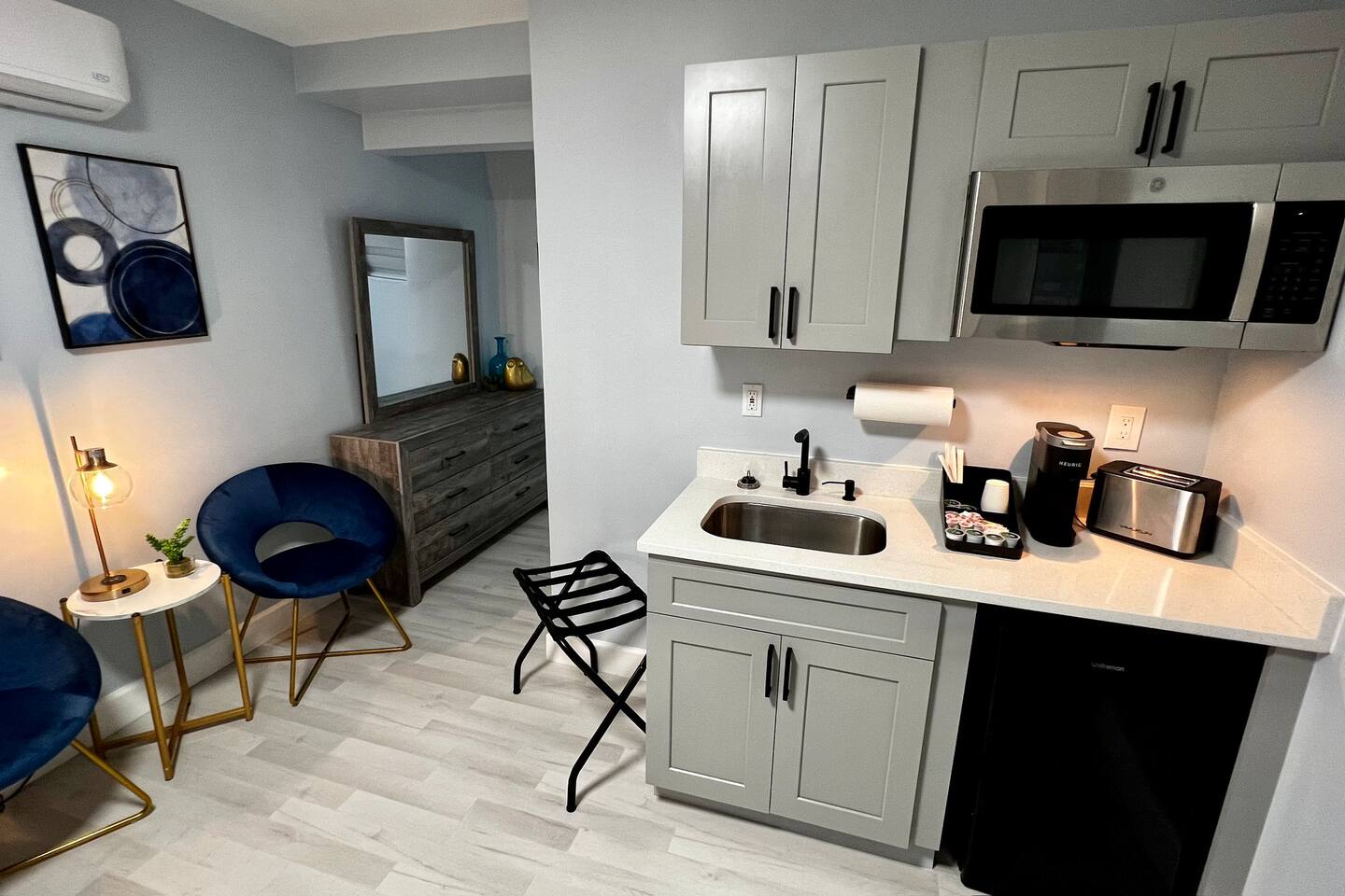 Each one of our suites was recently remodeled and redesigned, interior comes well-equipped with comforts for you to enjoy your stay. We are taking extra measures to keep our units extra clean for your comfort. Stylish and upscale King Suite connecting with Queen suite. Both suites have a private bathroom/shower with private kitchens. This King kitchen is absolutely beautiful with granite counter top, microwave, fridge coffee machine, 2 burners electric cooktop and a toaster. Inside the cabinets you can find pots, pans, plates, cups, ice bucket, utensils and cutlery as you may need. The queen suite has exactly same features except it's smaller and without the cooktop burners. Each one of those suites is equipped as follows: • Self check-in/out with our smart locks. • Every room has 43" smart HD TV for any online content and free high speed WiFi. • In the kitchen you'll find a Ice bucket. The ice machine is located at the vending room in the front of the property. • Wireless chargers for your phones are at the base of every bedside lamp. Also on the base of the lamp there is a USB plug. • Bluetooth speaker to connect to your device to play your favorite tunes. Also the top of the speaker is a wireless charger. • Bedroom and kitchen ceiling lights have 2 modes. Regular bright mode and night mode for very soft illumination at night. (First turn on the light switch to activate the light fixture. Switch off and back on again to activate night light mode.) • In addition to fluffy bathroom towels, there are also black towels for your makeup. • When ready to go to the beach, we prepared for you microfiber towels which fold light and easy to carry. They are also fast dry and sand free! • Zebra blinds that can either be set on light to go through with privacy or complete blackout. Every detail has been brought up to the highest level for your enjoyment! Enjoy the glamour of this stylish, upscale place.