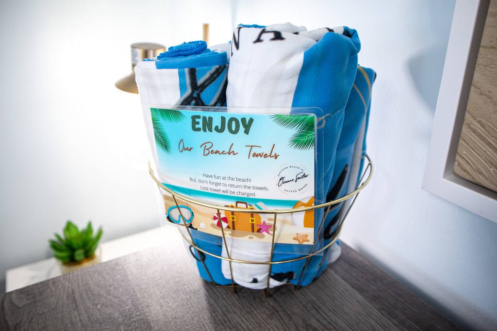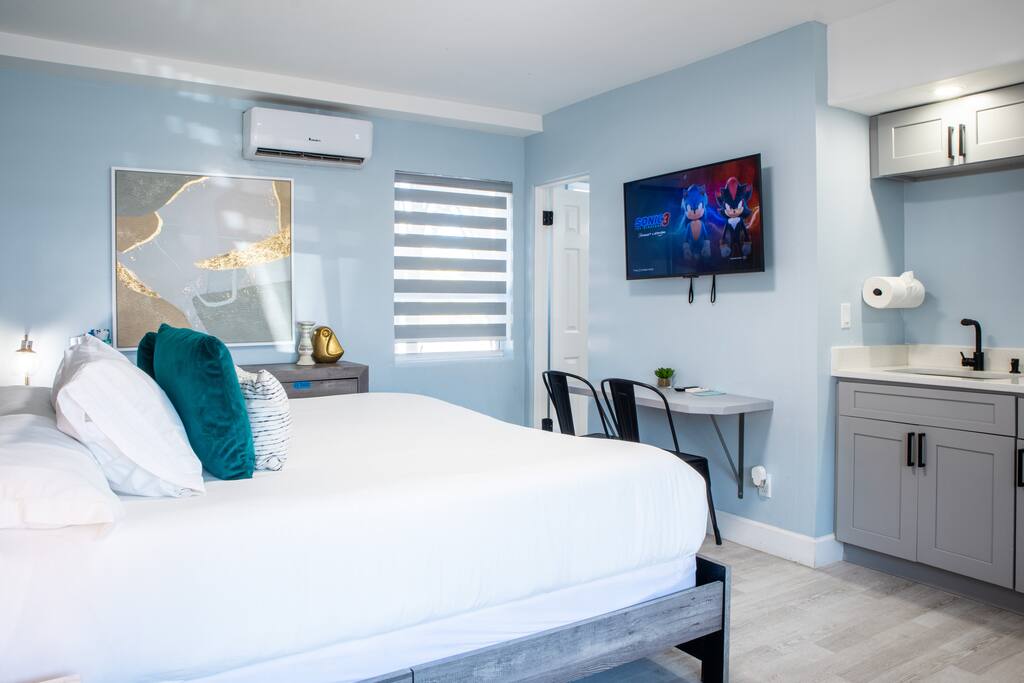 Each one of our suites was recently remodeled and redesigned, interior comes well-equipped with comforts for you to enjoy your stay. We are taking extra measures to keep our units extra clean for your comfort. This kitchen is absolutely beautiful with granite counter top, microwave, fridge coffee machine, 2 burners electric cooktop and a toaster. Inside the cabinets you can find pots, pans, plates, cups, ice bucket, utensils and cutlery as you may need. • Self check-in/out with our smart locks. • Every room has 43" smart HD TV for any online content and free high speed WiFi. • In the kitchen you'll find a Ice bucket. The ice machine is located at the vending room in the front of the property. • Wireless chargers for your phones are at the base of every bedside lamp. Also on the base of the lamp there is a USB plug. • Bluetooth speaker to connect to your device to play your favorite tunes. Also the top of the speaker is a wireless charger. • Bedroom and kitchen ceiling lights have 2 modes. Regular bright mode and night mode for very soft illumination at night. (First turn on the light switch to activate the light fixture. Switch off and back on again to activate night light mode.) • In addition to fluffy bathroom towels, there are also black towels for your makeup. • When ready to go to the beach, we prepared for you microfiber towels which fold light and easy to carry. They are also fast dry and sand free! • Zebra blinds that can either be set on light to go through with privacy or complete blackout. Every detail has been brought up to the highest level for your enjoyment! Enjoy the glamour of this stylish, upscale place.