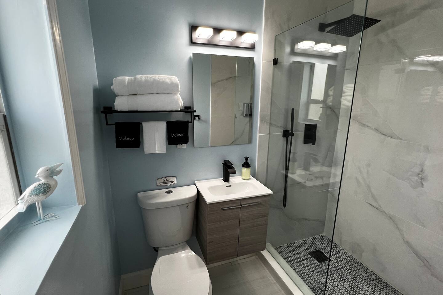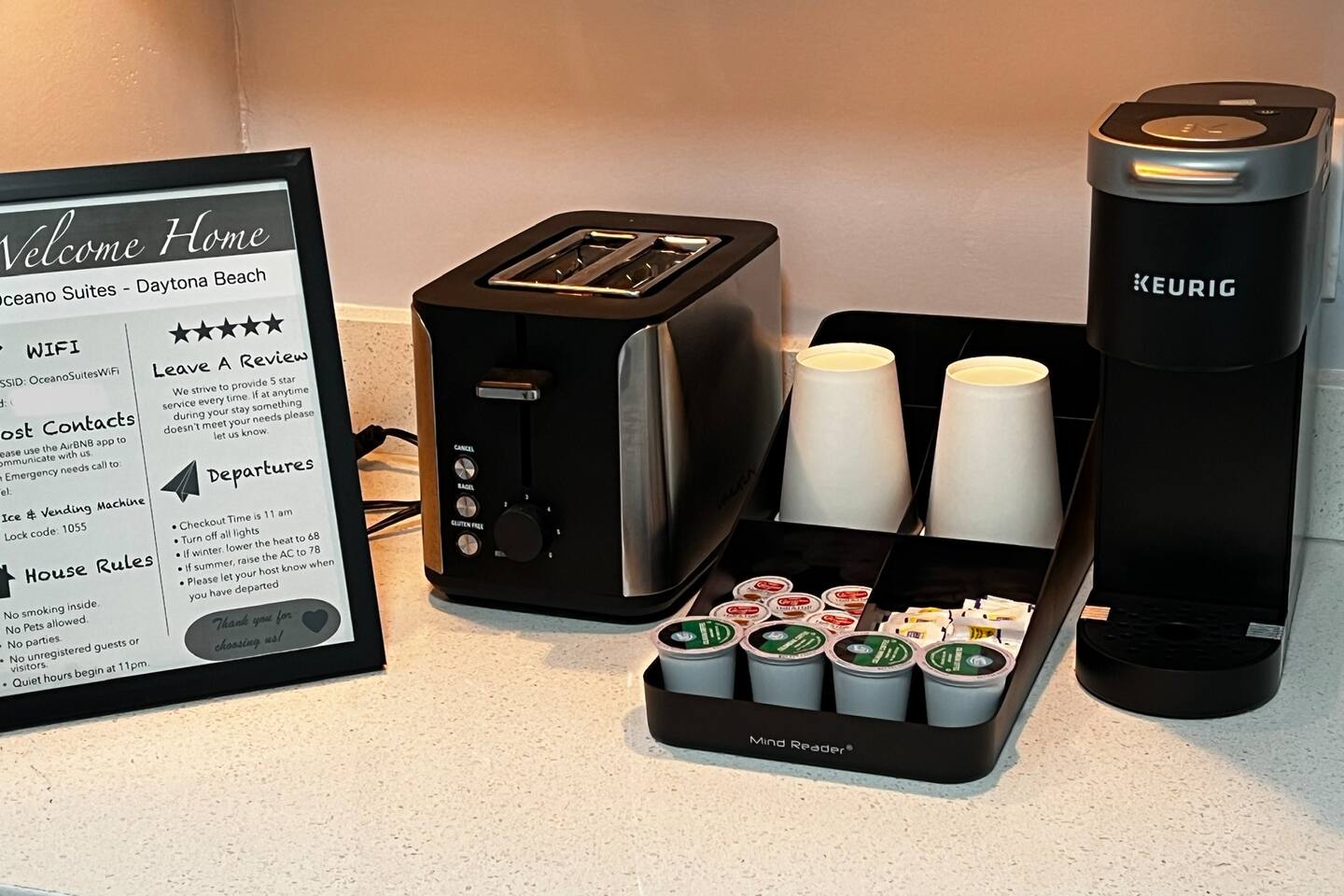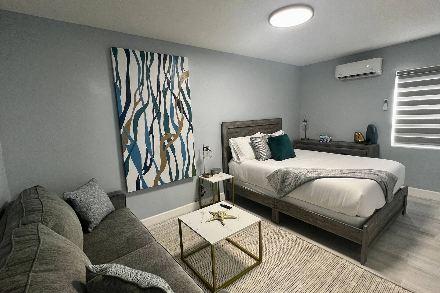 Each one of our suites was recently remodeled and redesigned, interior comes well-equipped with comforts for you to enjoy your stay. We are taking extra measures to keep our units extra clean for your comfort. The couch in the living room opens into a queen sleeper to maximize occupancy (if needed). There is a kitchenette opening into the living room. This kitchen is absolutely beautiful with granite counter top, microwave, fridge coffee machine and a toaster. Inside the cabinets you can find plates, cups, utensils and cutlery as you may need. • Self check-in/out with our smart locks. • Every room has 43" smart HD TV for any online content and free high speed WiFi. • In the kitchen you'll find a Ice bucket. The ice machine is located at the vending room in the front of the property. • Wireless chargers for your phones are at the base of every bedside lamp. Also on the base of the lamp there is a USB plug. • Bluetooth speaker to connect to your device to play your favorite tunes. Also the top of the speaker is a wireless charger. • Bedroom and kitchen ceiling lights have 2 modes. Regular bright mode and night mode for very soft illumination at night. (First turn on the light switch to activate the light fixture. Switch off and back on again to activate night light mode.) • In addition to fluffy bathroom towels, there are also black towels for your makeup. • When ready to go to the beach, we prepared for you microfiber towels which fold light and easy to carry. They are also fast dry and sand free! • Zebra blinds that can either be set on light to go through with privacy or complete blackout. Every detail has been brought up to the highest level for your enjoyment! Enjoy the glamour of this stylish, upscale place.