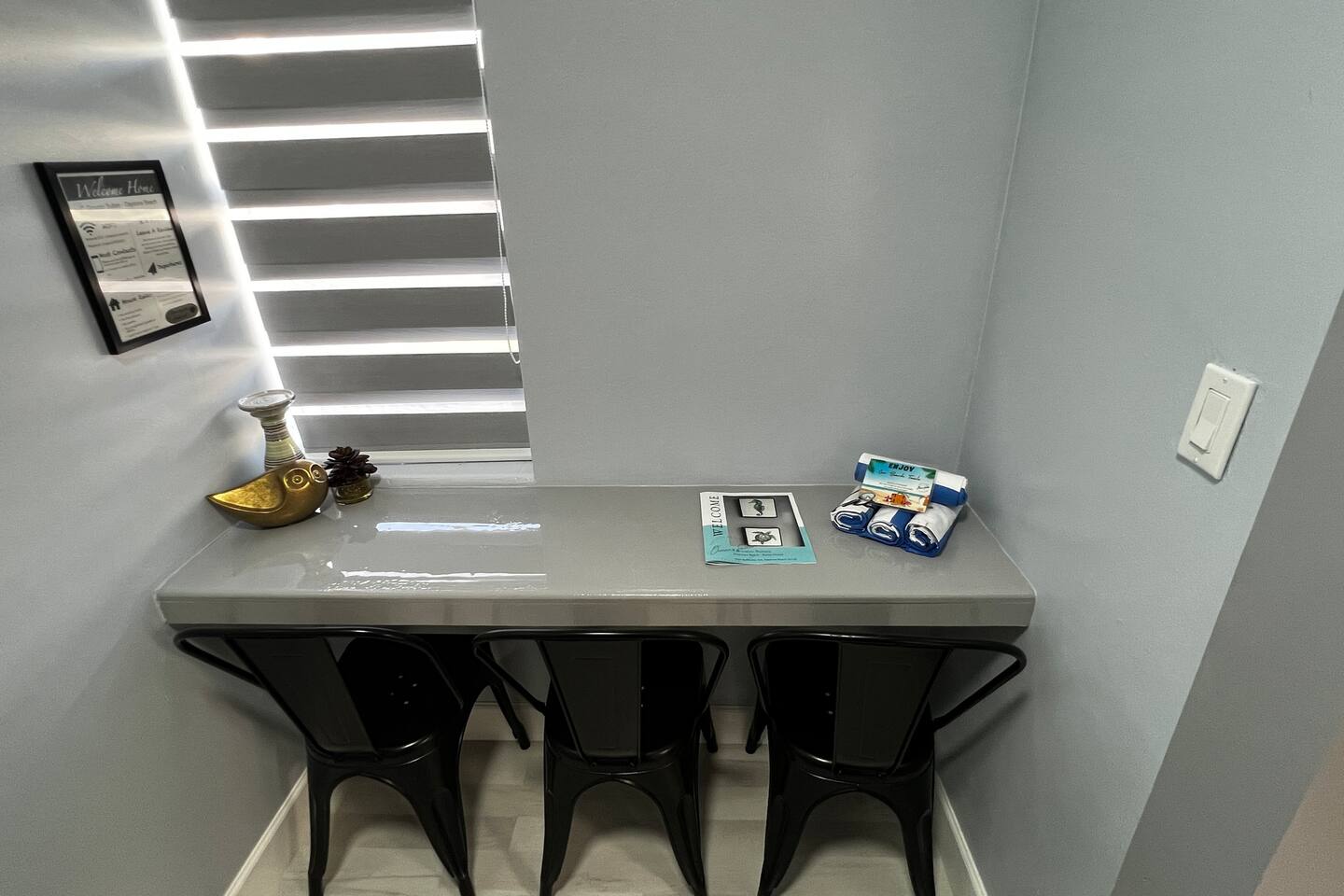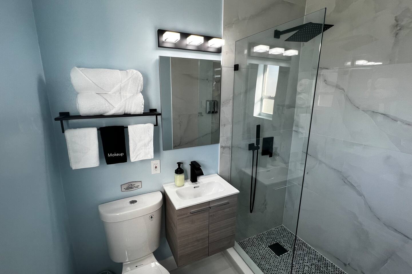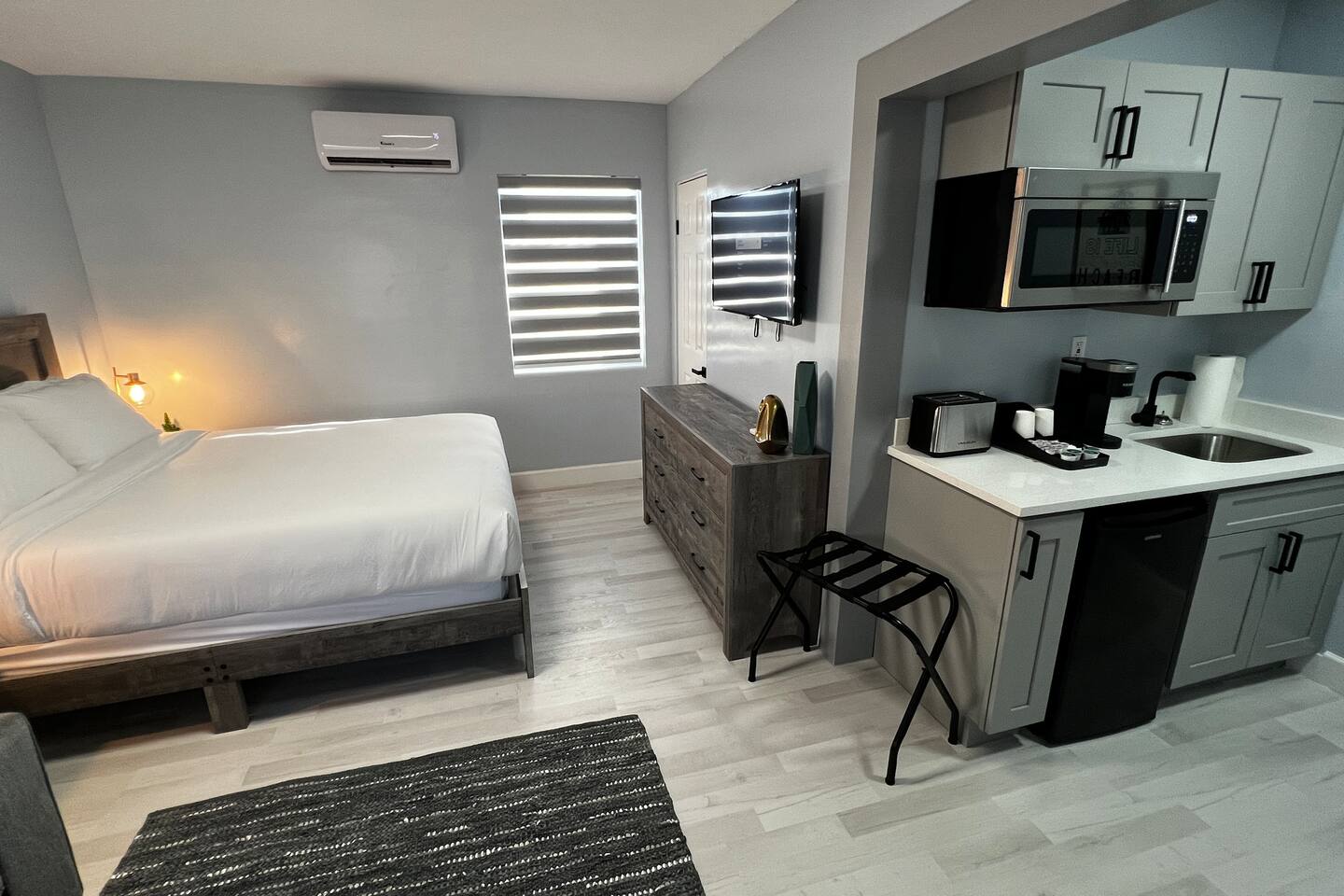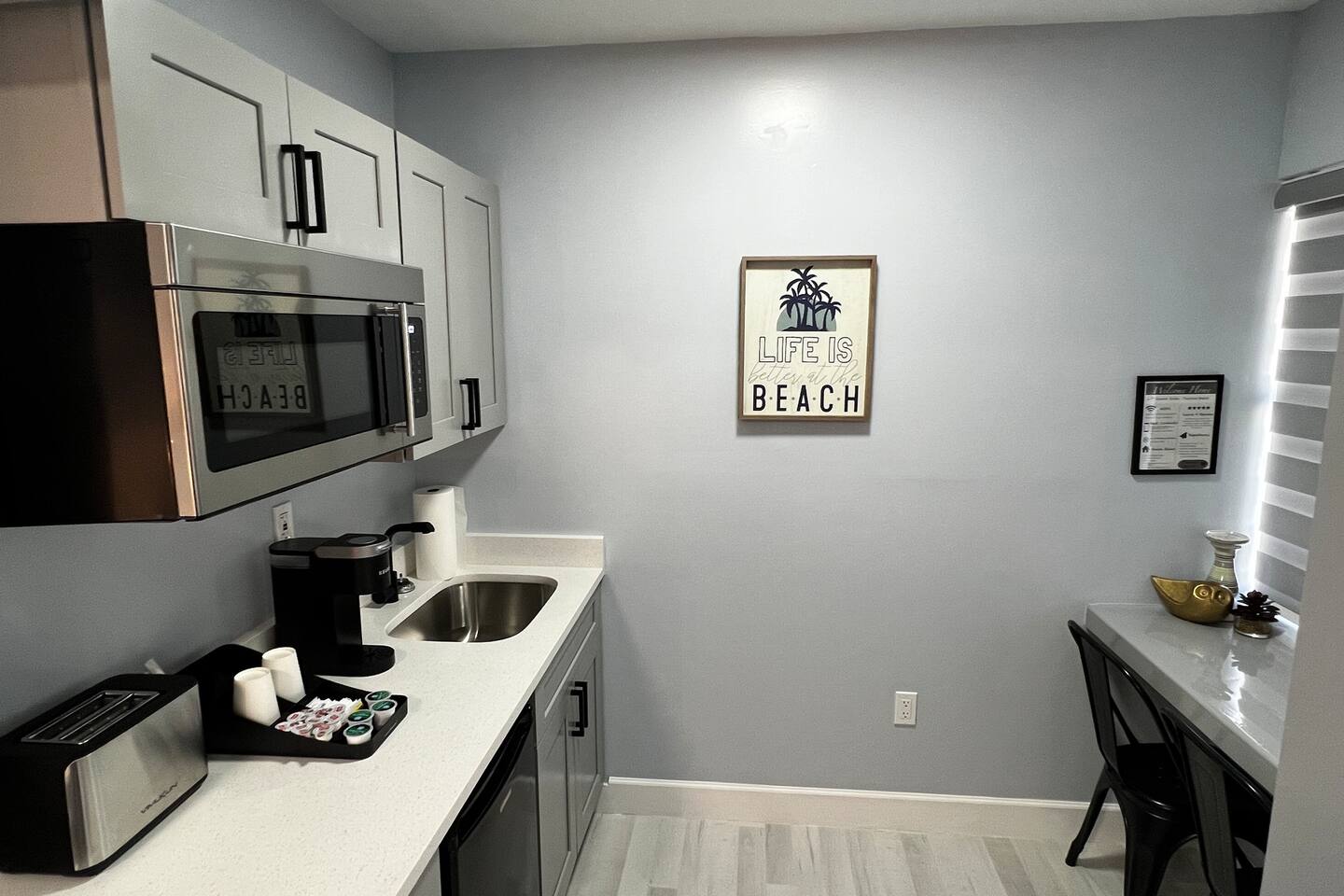 Each one of our suites was recently remodeled and redesigned, interior comes well-equipped with comforts for you to enjoy your stay. We are taking extra measures to keep our units extra clean for your comfort. The couch in the living room opens into a queen sleeper to maximize occupancy (if needed). There is a kitchenette opening into the living room. This kitchen is absolutely beautiful with granite counter top, microwave, fridge coffee machine and a toaster. Inside the cabinets you can find plates, cups, utensils and cutlery as you may need. • Self check-in/out with our smart locks. • Every room has 43" smart HD TV for any online content and free high speed WiFi. • In the kitchen you'll find a Ice bucket. The ice machine is located at the vending room in the front of the property. • Wireless chargers for your phones are at the base of every bedside lamp. Also on the base of the lamp there is a USB plug. • Bluetooth speaker to connect to your device to play your favorite tunes. Also the top of the speaker is a wireless charger. • Bedroom and kitchen ceiling lights have 2 modes. Regular bright mode and night mode for very soft illumination at night. (First turn on the light switch to activate the light fixture. Switch off and back on again to activate night light mode.) • In addition to fluffy bathroom towels, there are also black towels for your makeup. • When ready to go to the beach, we prepared for you microfiber towels which fold light and easy to carry. They are also fast dry and sand free! • Zebra blinds that can either be set on light to go through with privacy or complete blackout. Every detail has been brought up to the highest level for your enjoyment! Enjoy the glamour of this stylish, upscale place.