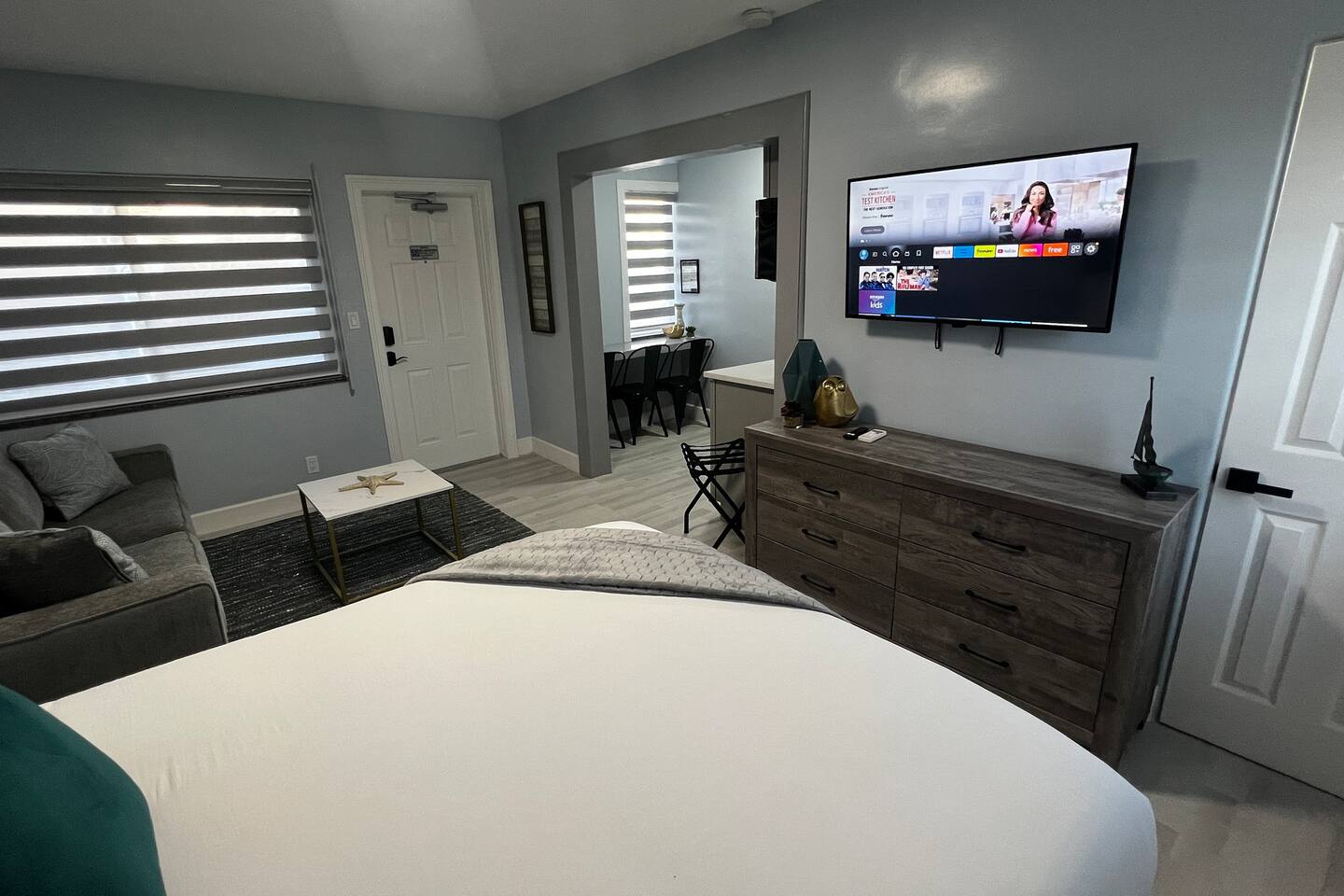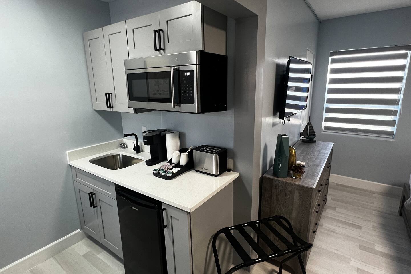 Each one of our suites was recently remodeled and redesigned, interior comes well-equipped with comforts for you to enjoy your stay. We are taking extra measures to keep our units extra clean for your comfort. The couch in the living room opens into a queen sleeper to maximize occupancy. There is a kitchenette opening into the living room. This kitchen is absolutely beautiful with granite counter top, microwave, fridge coffee machine and a toaster. Inside the cabinets you can find plates, cups, utensils and cutlery as you may need. Every room has its own smart TV for any online content, free high speed WiFi. Self check-in/out with our smart locks. Every detail has been brought up to the highest level for your enjoyment! Enjoy the glamour of this stylish, upscale place.
